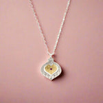 A single ruby is hand set in a yellow gold heart that's nested inside a diamond-embellished sterling silver pendant.