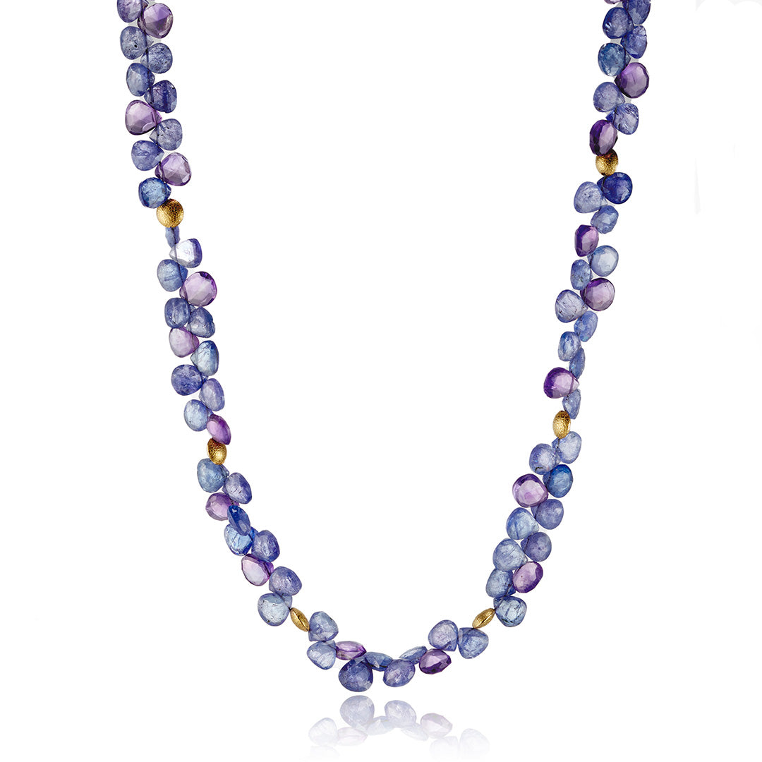 Clusters of deep blue tanzanite and violet amethyst briolettes are strung in a rhythm that feels both organic and refined. Gold beads stations add warmth and texture, catching the eye without overpowering the natural beauty of the stones.
