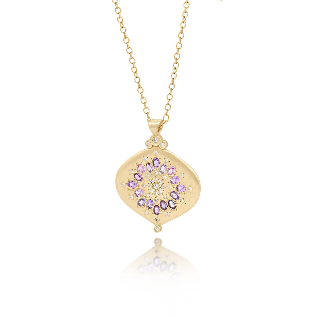 An array of pastel-colored sapphires surround bezel-set diamonds on this 18-karat yellow gold pendant necklace.