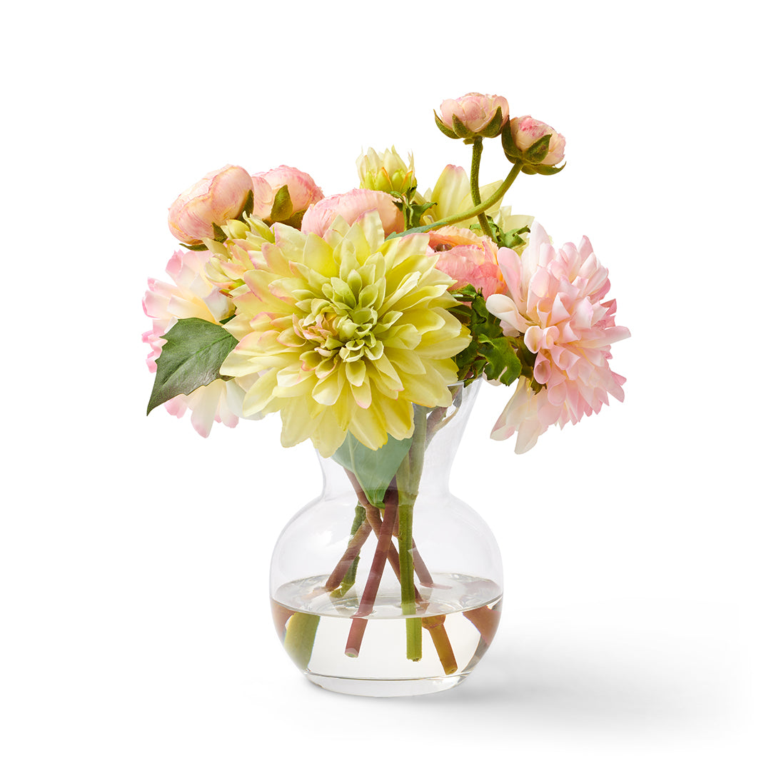 Bursting with the first blooms of the season, this artistic display showcases heavenly dahlias and ranunculus. The making of artificial flowers is an ancient art that originated in China's Tang Dynasty more than 1,300 years ago. Bountiful arrangements of color and texture, our exquisite blossoms are meticulously shaped and painted by hand. Designed to mimic nature’s beauty, these remarkable faux botanicals bring every room to life.