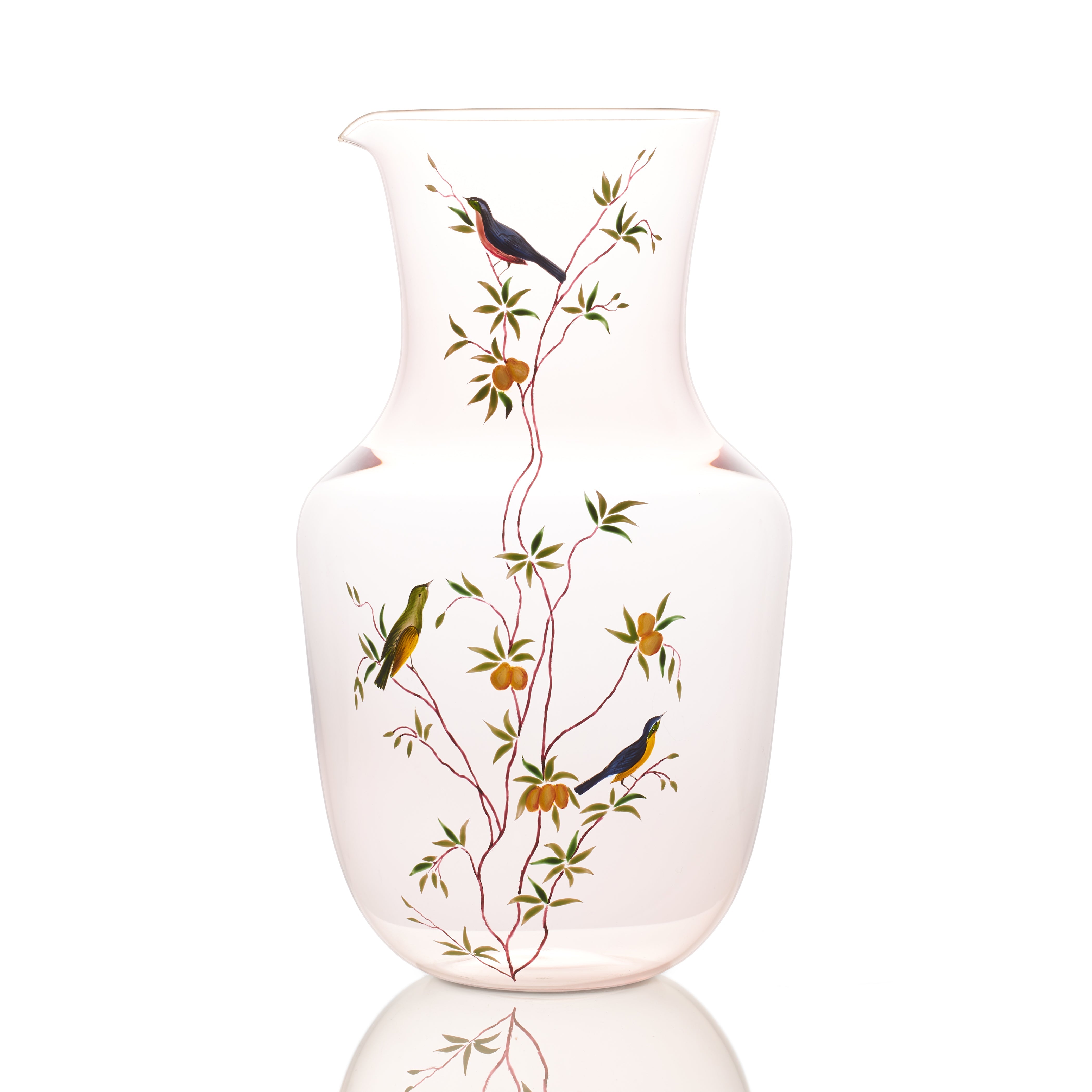 Mouthblown from lead-free crystal, this pitcher is handpainted with a garden motif for an elegant touch. 4 3/4" diam. x 8"H.