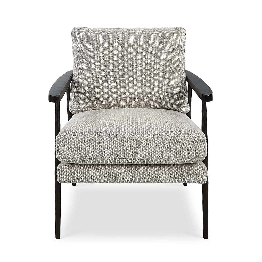 A study in contrast and proportion, this distinctive chair balances tailored comfort with industrial edge. Its cast iron frame, finished in dark bronze, lends subtle strength beneath structured cushions in an ivory-beige weave. Dark walnut arms in solid oak bring a warm, crafted touch — striking the perfect note between modern sophistication and relaxed ease.