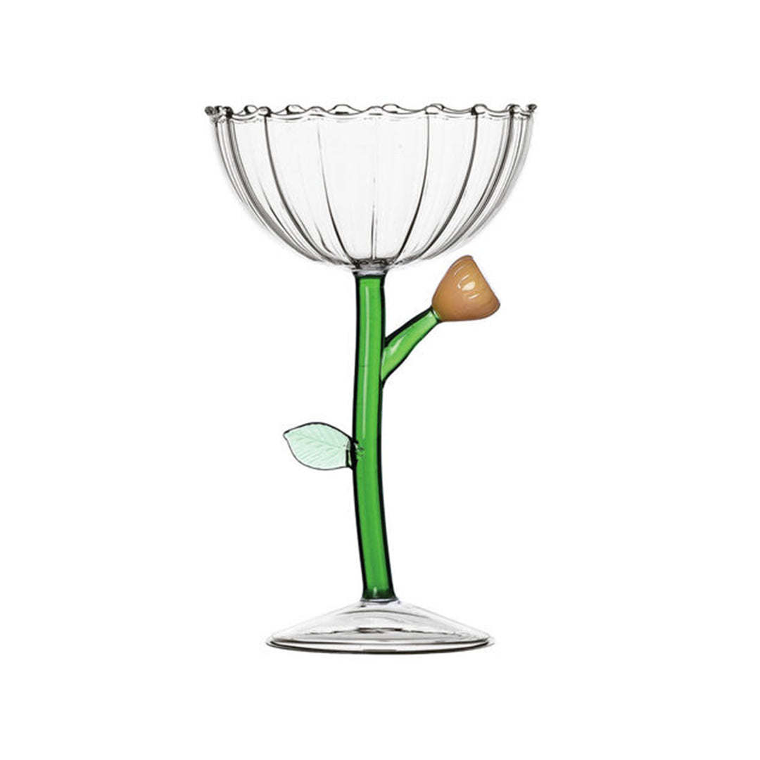 Crafted by hand in Italy from borosilicate glass, this fanciful coupe reinterprets floral form with a fresh perspective. It features a golden amber bud resting on a gracefully curved green stem—equal parts glassware and garden dream. A conversation piece with every pour.