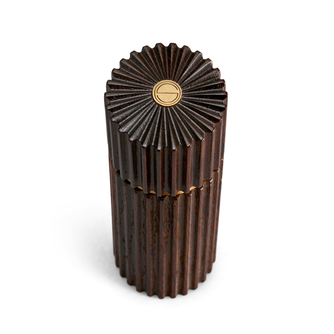 The modern, sleek silhouettes of these salt and pepper mills will turn seasoning your food into unmistakably chic event. Hand-carved in Portugal of smoked oak, they're adorned with handsome brass details and are expertly outfitted with high-quality metal grinding mechanisms.