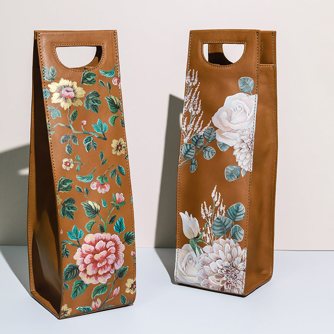 Handpainted with romantic blooms that recall a bridal bouquet, this leather wine carrier turns a simple bottle into an artful and memorable gift.