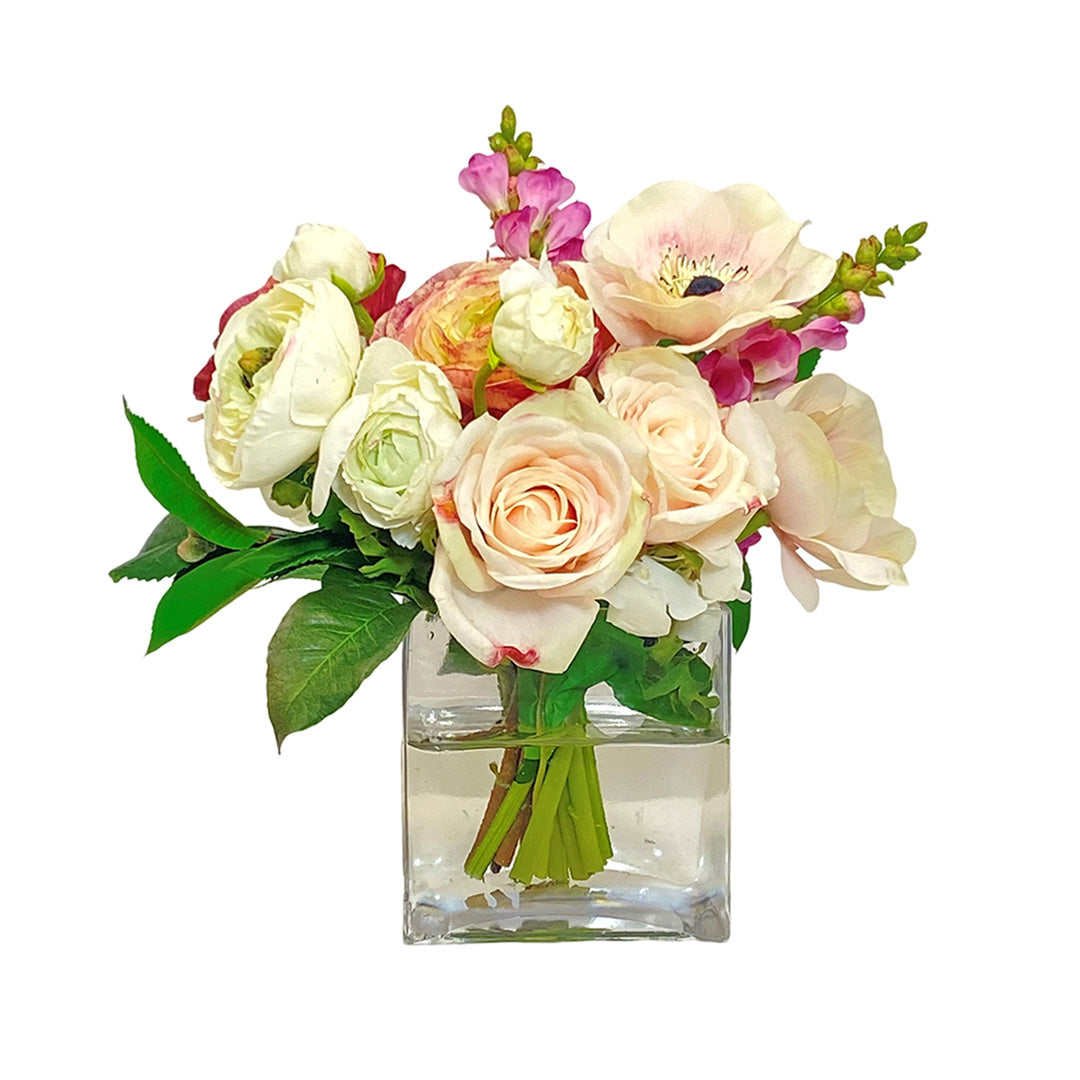 Elegantly arranged in a round glass bowl with water illusion, our bunch of ranunculus and roses looks just-picked from the garden — but will last much longer. The making of artificial flowers is an ancient art that originated in China's Tang Dynasty more than 1,300 years ago. Bountiful arrangements of color and texture, our exquisite greenery is meticulously shaped and painted by hand to perfectly mimic nature’s beauty.