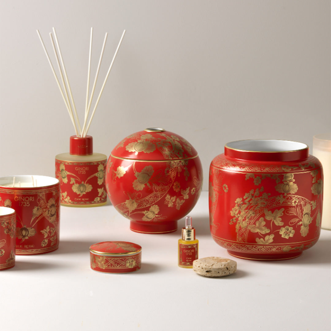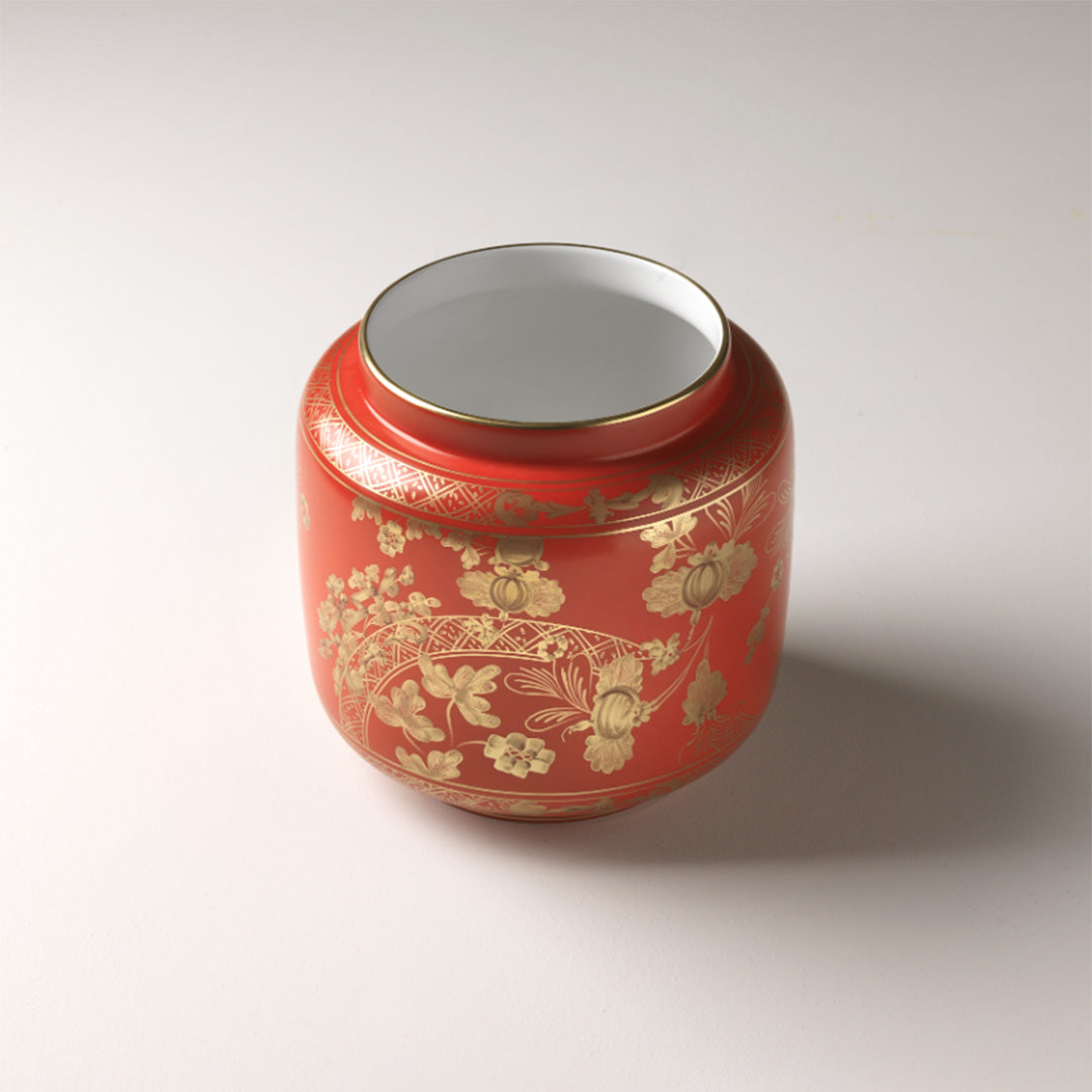 Use this vase to house a candle of your choosing as an elegant way to bring light to a dinner or side table. Or, try stacking two or three of them in the the same Orient Italiano color or a mix of colors to create a beautiful objet d'art. Designed by Gio Ponti in 1946, the Oriente Italiano collection brings together elements of East and West to brilliant effect. Stylized garofani, or carnations, blossom on handcrafted porcelain in a palette of gold and a rich red.