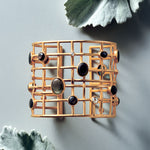 This elegant cuff puts on a stunning display of black star sapphires and rose-cut diamonds set against a graphic backdrop of 18-karat yellow gold.