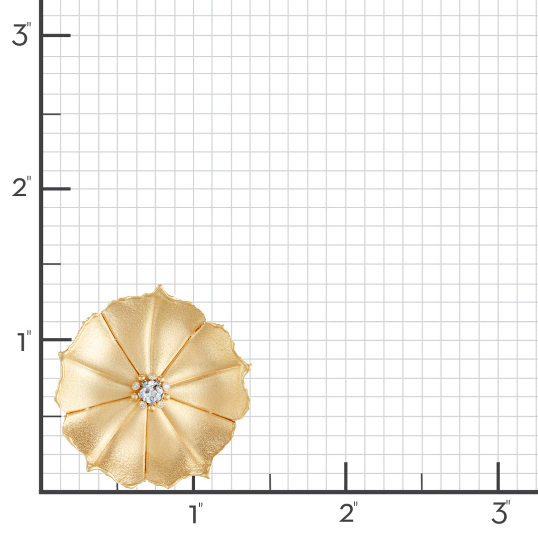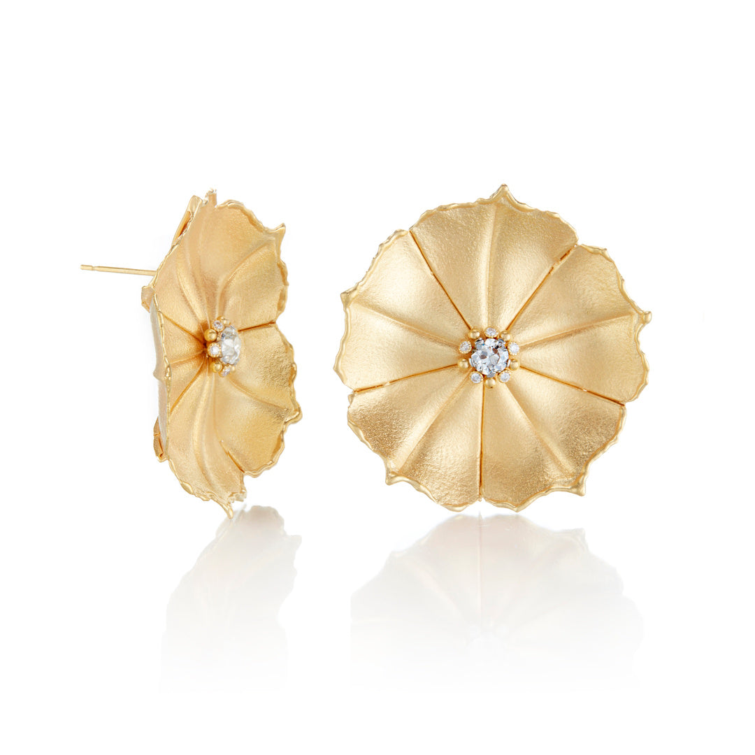 Broad satin-finished petals radiate from a central European-cut diamond, accented by a delicate ring of smaller brilliant stones. The earrings’ bold floral form highlights both sculptural detail and refined sparkle.