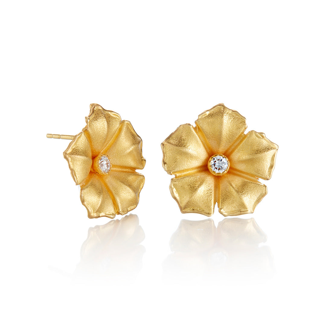 Petite morning glory blooms in satin-finished gold are each centered with a single diamond. The sculpted petals create a delicate play of texture, lending the earrings refined charm in a smaller scale.