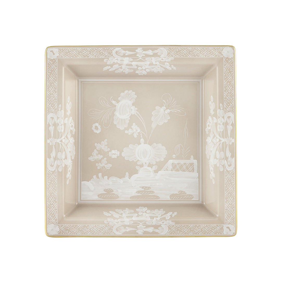 Designed by Gio Ponti in 1946, the Oriente Italiano collection brings together elements of East and West to brilliant effect. The timeless pattern features stylized garofani, or carnations, blossoming on handcrafted porcelain in a palette of beige and white.