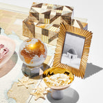 A sight to behold, this extraordinary globe features a crisp white ocean canvas decorated with clean lines, pencil-sharp details and slick gold continents that glimmer in the light. It’s a color choice that is bold in its simplicity, yet undeniable in its elegance — the new “golden rule” for your modern urban décor needs. Each globe combines vibrant artwork with patented technology, creating a flawless rotation without batteries or cords. Hidden solar cells use ambient natural or artificial light for power, while the earth’s magnetic field provides the necessary torque. These elements work seamlessly to power a 'whisper-quiet' mechanism, allowing the globe to rotate within its clear outer shell.