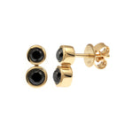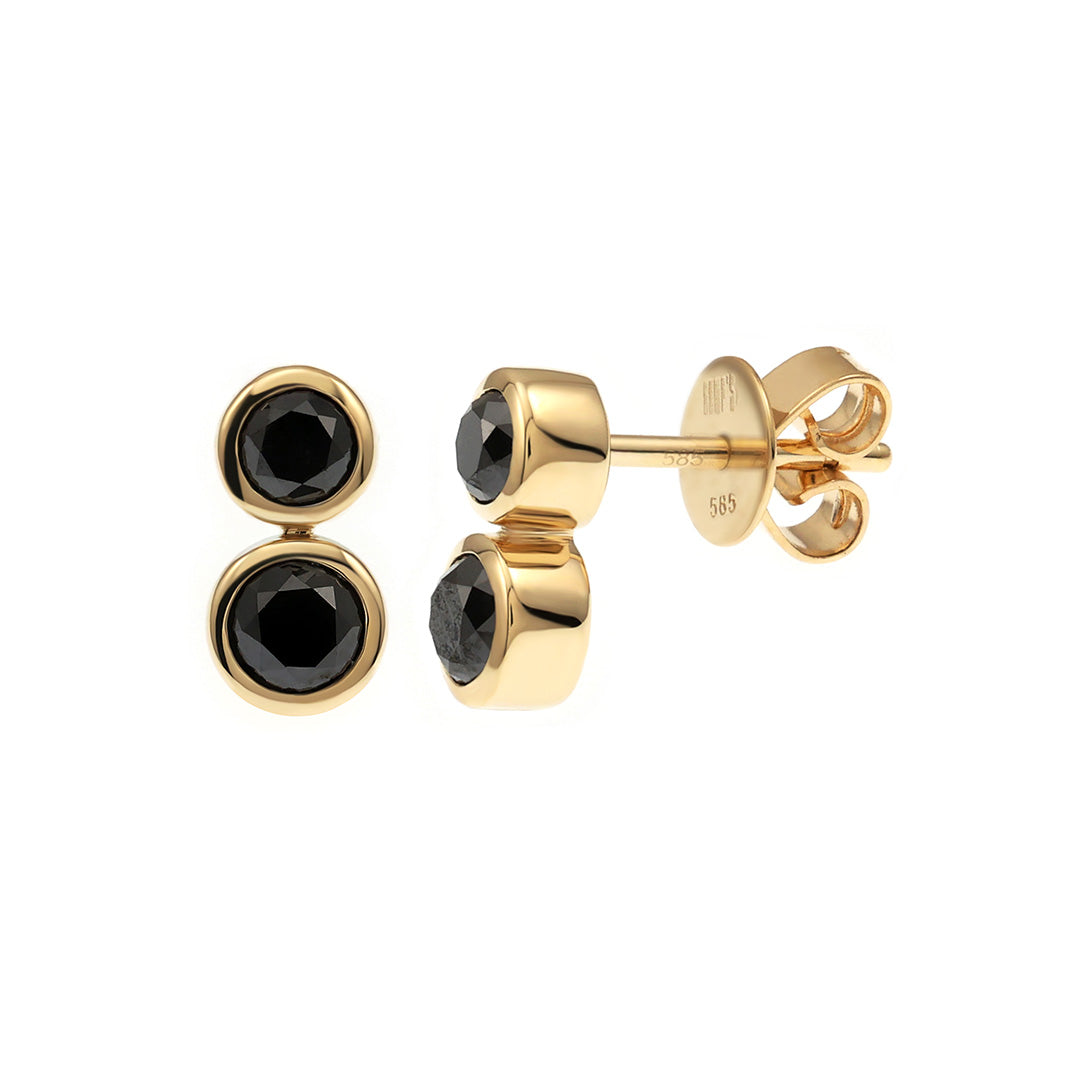 Two bold black diamonds, bezel-set in luminous gold, create a striking vertical silhouette with quiet asymmetry. Modern and balanced, these earrings hint at duality with an edge.