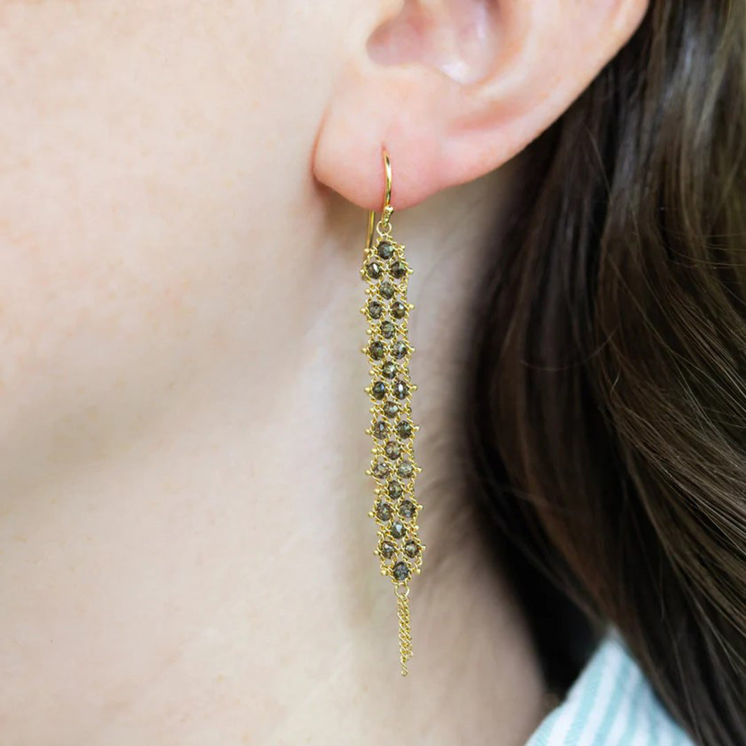 Like glistening raindrops captured in rays of sunlight, these earrings feature a row of champagne diamonds suspended in hand-woven lengths of 18-karat gold chain. Slender and flexible, the bewitching beauties sway gently with you as you move through the world.
