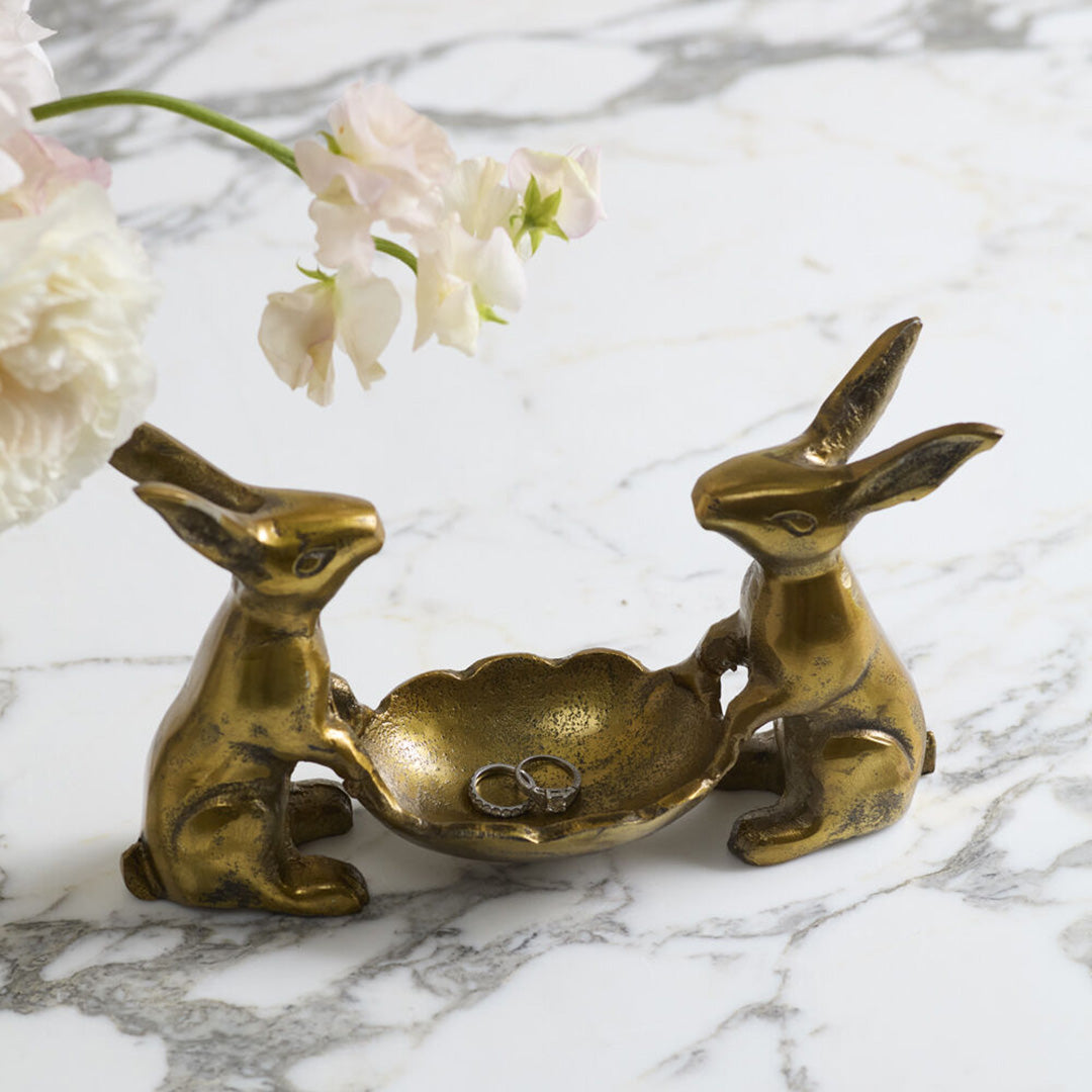 For a touch of storybook charm, this sweetly symmetrical duo make a playful spring accent piece. Cast in metal with a lightly antiqued finish, it’s a whimsical accent for trinkets, keys or whatever else needs an enchanting resting place.