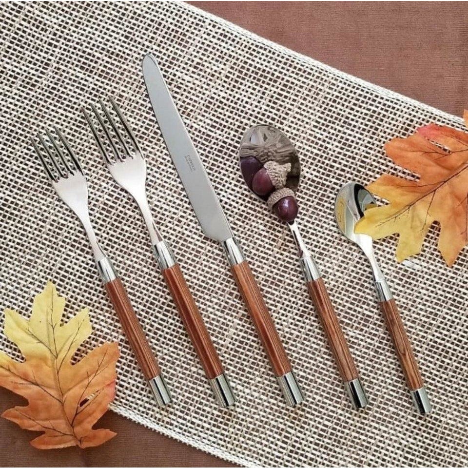 Made of polished stainless steel, this place setting adds a refined touch to the table with its wood-patterned acrylic handles. Established in 1952, BIA Cordon Bleu is known for its superior stoneware, porcelain dinnerware and bakeware. Its beautifully crafted products are as ideal for entertaining as they are for everyday use. Includes salad fork, dinner fork, dinner knife, tablespoon and teaspoon. Made in France. Hand-wash.
