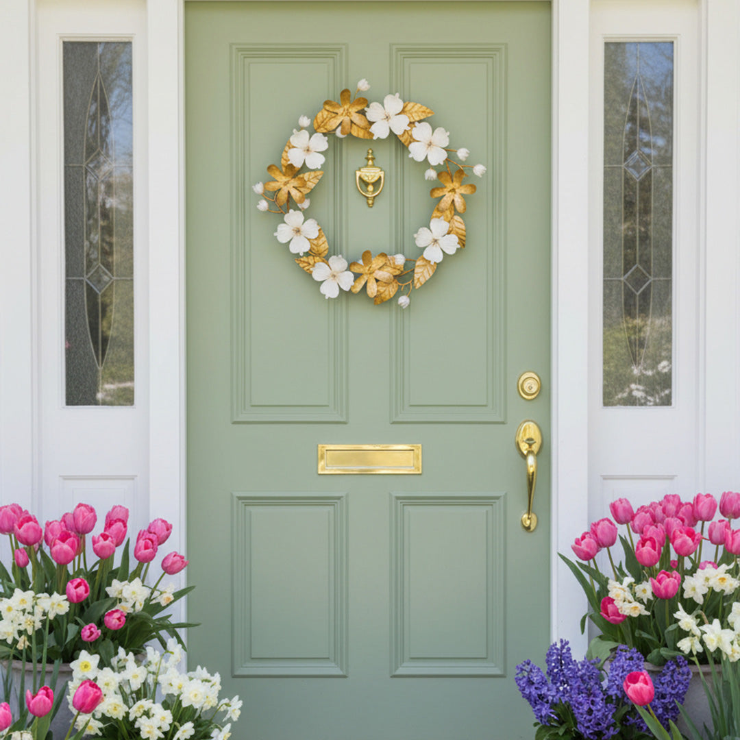 Delicate dogwood blossoms and golden leaves encircle this sculptural wreath, each element cast and painted by hand with exquisite attention to detail. The composition strikes a graceful balance between botanical charm and artful sophistication.