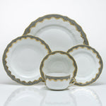Made of white porcelain and handpainted by master artisans in Hungary, this elegant plate is bordered in gray and 24-karat yellow gold. Herend’s porcelain creations feature a signature pattern that dates back to 1874, when a fish-scale decoration inspired a craftsman to create a similar design. 6" diam.