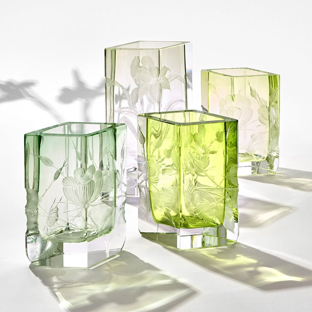 The tender petals of roses, lilies and hibiscuses embrace this hand-blown, hand-cut and hand-engraved vase made of the finest Czech crystal. Its robust sides contrast with the marvelously delicate pattern, while the green underlay is a guarantee of perfect visual harmony.