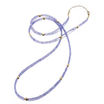 A wrap bracelet featuring tanzanite beads, gold bead spacers and a lobster clasp with a 2" long extension chain. Can also be worn as a necklace.