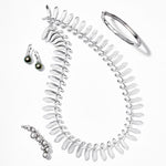 Dozens of feather-like sterling silver shapes link together to form this dramatic collar necklace that encircles the neck, tracing the collarbone and framing the face beautifully. Taken from an original design in the Georg Jensen archives, this stunning example of mid-century Scandinavian jewelry retains a sense of occasion that works as well today as when first conceived.