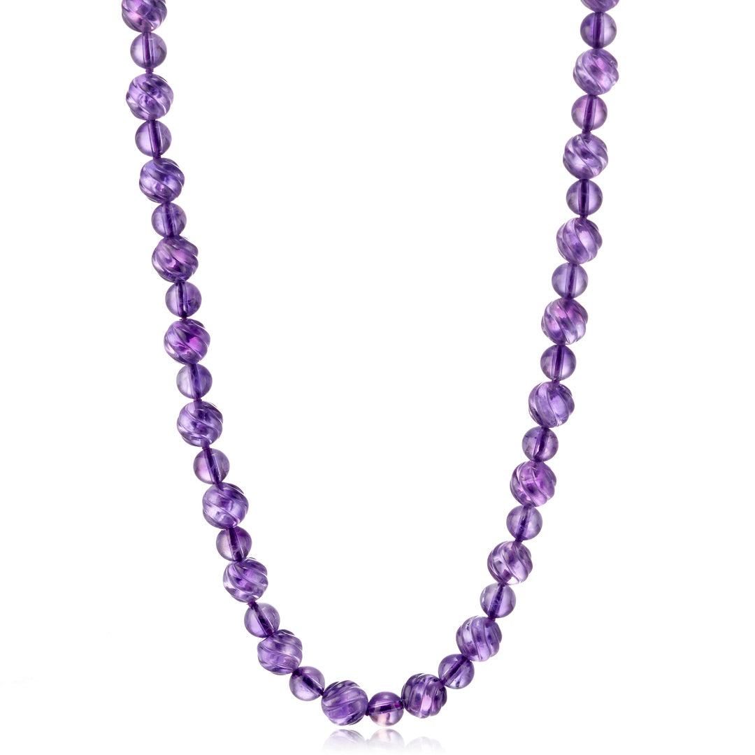 Alternating between smooth and carved amethyst beads, our necklace offers a dynamic interplay of texture and tone. The rope-style strand showcases the stone’s natural depth in a palette of rich purples, lending a sculptural presence whether worn long or doubled.