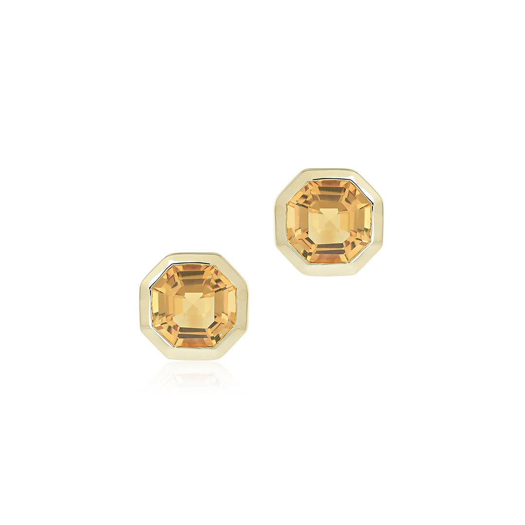 Asscher-cut citrine stones are framed in octagonal gold settings, highlighting the gem’s precision and warm, golden hue. The structured silhouette offers a refined take on a stone long associated with clarity and confidence.