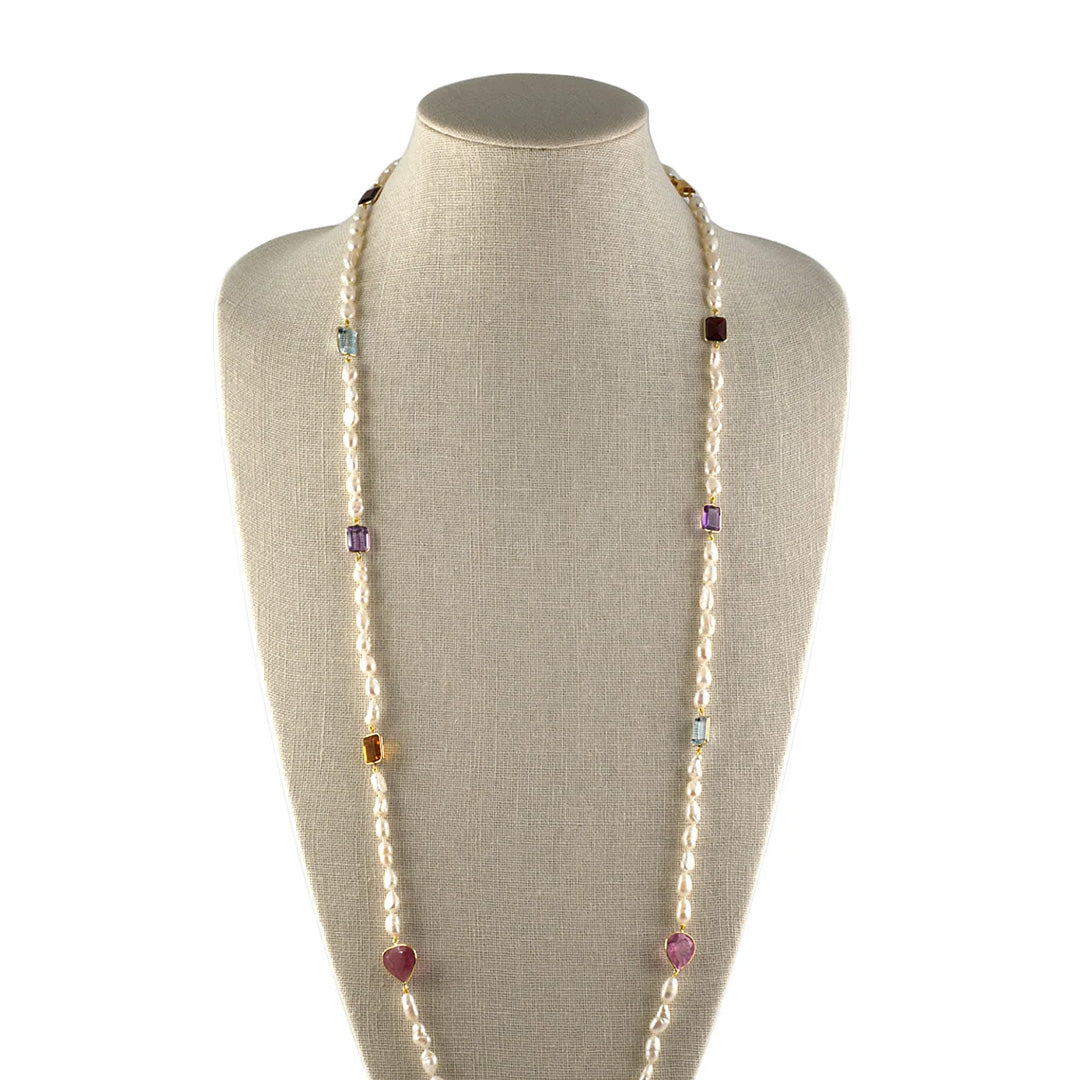 This necklace marries the luminous glow of freshwater baroque pearls with the brilliance of vibrant gemstones. Interspersed along the strand are faceted citrine, pink tourmaline, amethyst, garnet, and blue topaz, each framed in gold to highlight their unique hues.