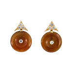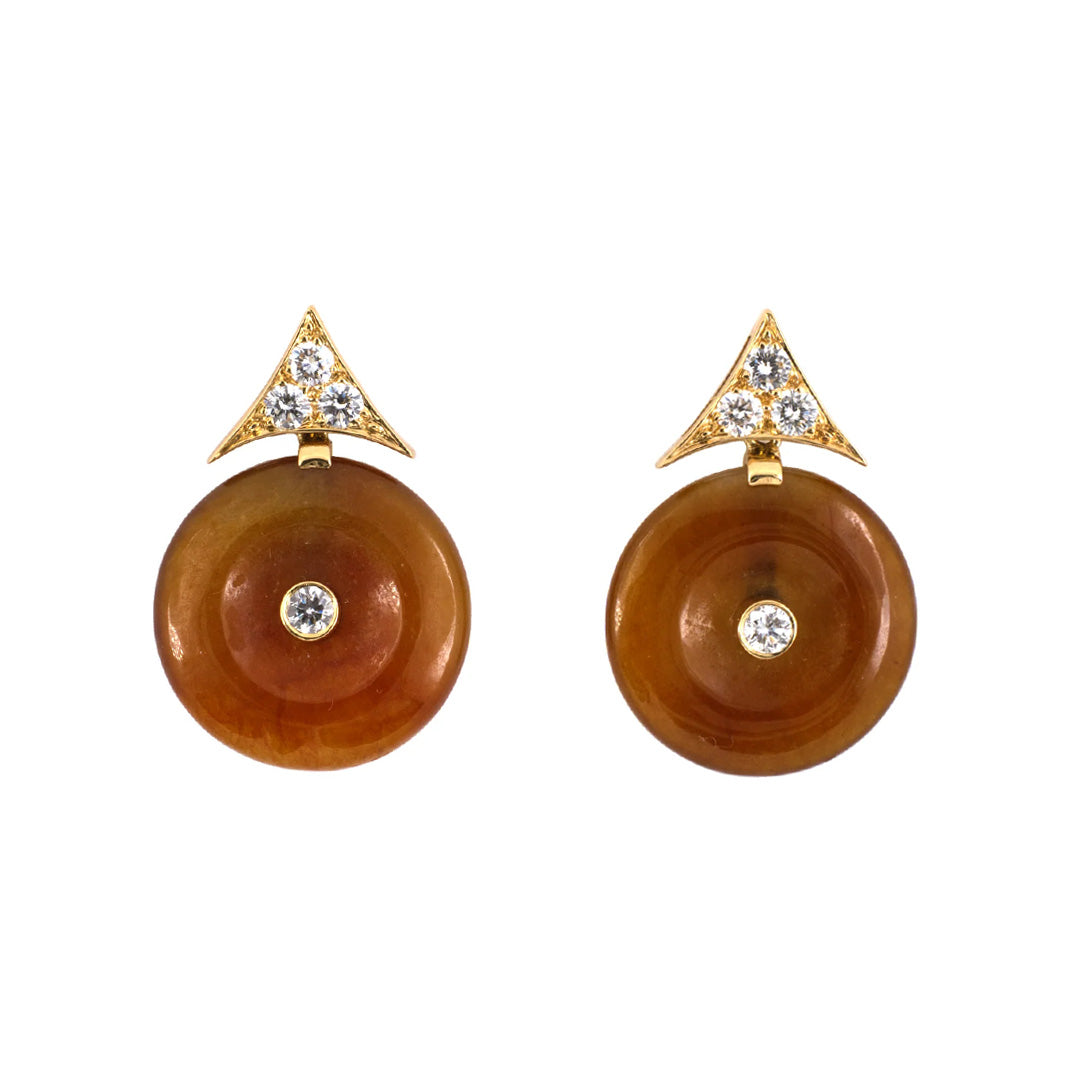 A sharply defined triangular top, set with diamonds in yellow gold, gives way to a suspended red jadeite pi disc. Centered with a brilliant diamond, the earrings are a study in contrast between structure and serenity.