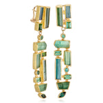 A mosaic of green tourmalines in varied cuts and tones cascades down these earrings, each stone set within textured yellow gold. The linear arrangement creates a dynamic balance of structure and movement, highlighting the gem’s natural depth.