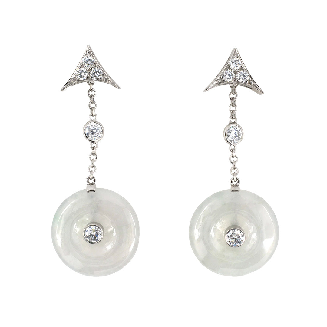 Diamond-set platinum triangles form a striking architectural crest, suspending luminous jadeite discs carved in the timeless pi form. The cool translucence of the pale ice jade is punctuated by bezel-set diamonds, creating a quiet interplay of geometry and light.