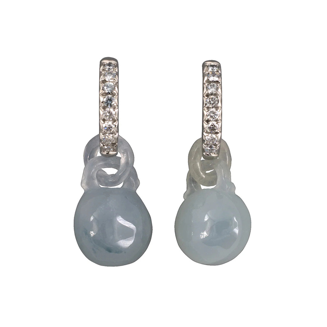 Slim platinum hoops lined with brilliant diamonds suspend softly carved jadeite dumbbell drops in a cool blue-gray. The contrast between crisp pavé and the rounded, symbolic form below reflects a thoughtful balance of precision and tradition.