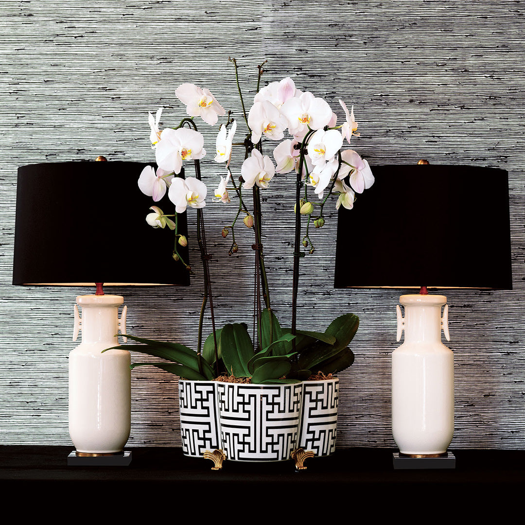 Sometimes a straightforward silhouette is all you need to complete a room. Modern Asian influences inspired our cream crackled porcelain lamp, featuring accents of a square black crystal base and aged brass finish hardware. Subtle light passes through the black fabric shade when illuminated.