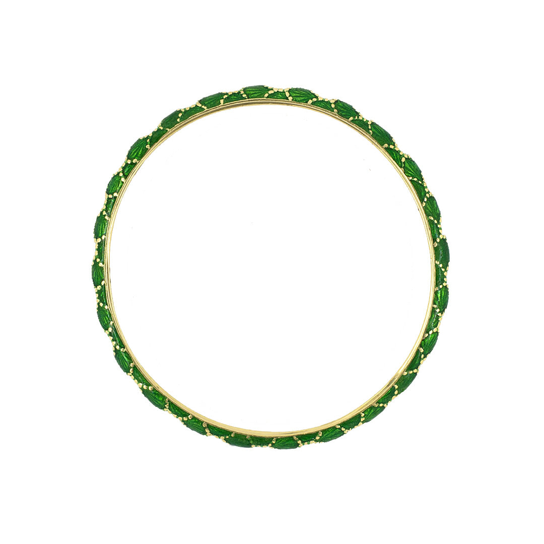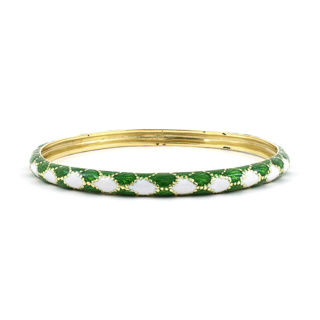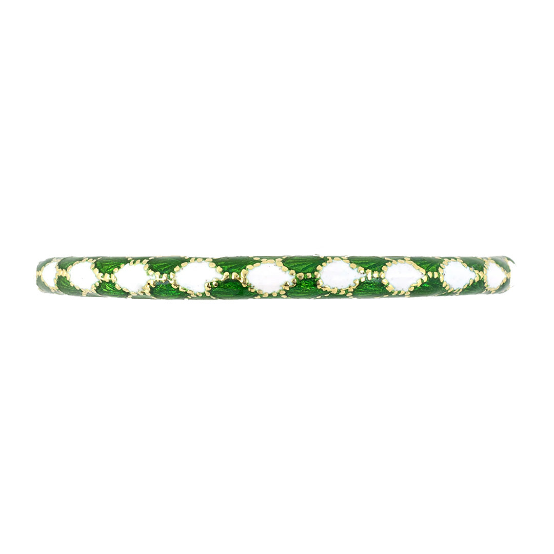 This slender bangle from Tiffany & Co. features a lively band of green enamel adorned with repeating white motifs, creating a rhythmic pattern around the gold form. Delicate texturing within the enamel adds depth and dimension to the surface.